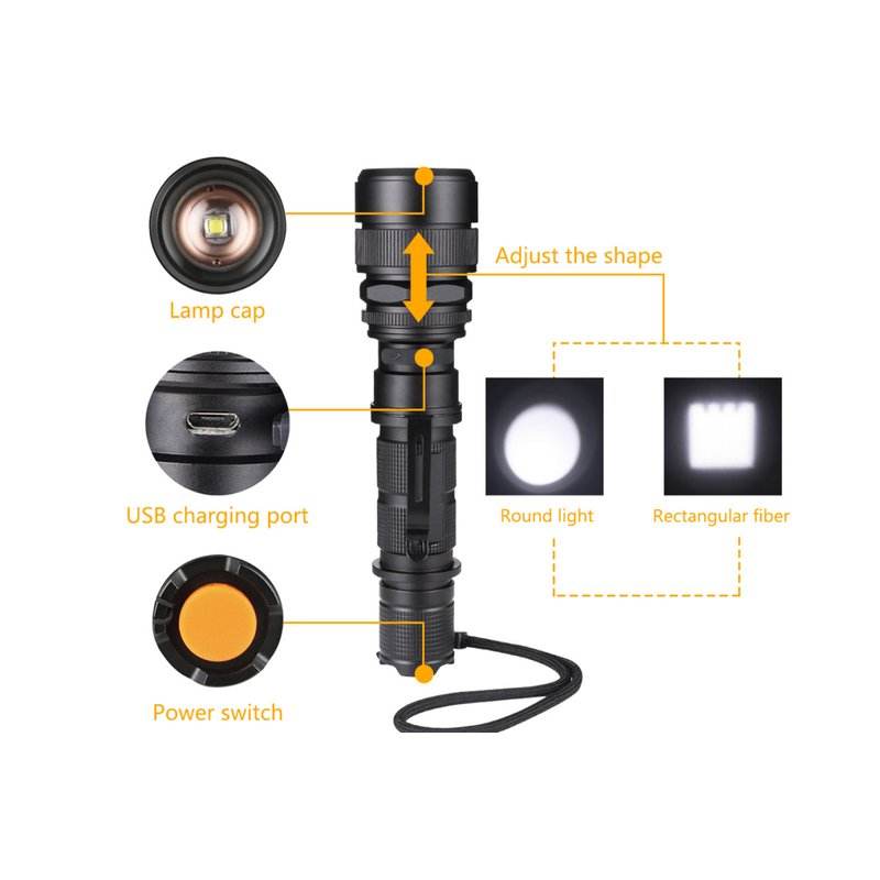Torcia Portatile Ricaricabile Zoomabile Tattica da Campeggio Sportiva Impermeabile 5 Modalità di Illuminazione - Auto e Moto / Auto