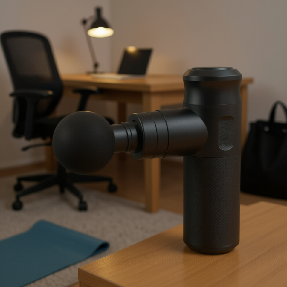 Pistola per massaggio percussivo portatile a 4 velocità con 4 testine per il rilassamento dei tessuti profondi, ideale per ufficio, palestra, casa, allenamento e relax.