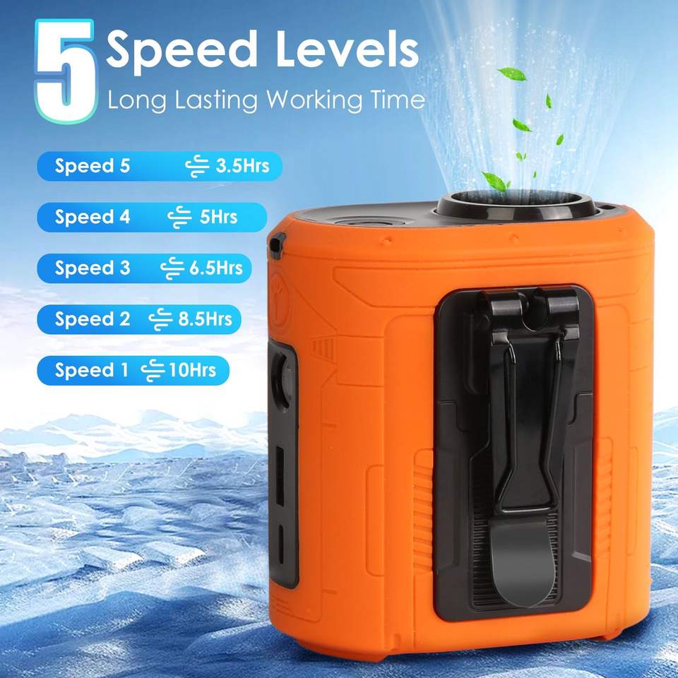 Ventilatore Portatile e Indossabile a 5 Velocità con Batteria da 10000mAh, Torcia e Clip da Cintura, Ventilatore Portatile a Mani Libere con Clip da Cintura