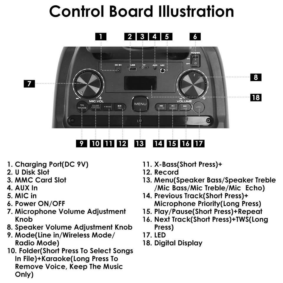 Altoparlante Portatile Wireless per Feste con 5 Modalità di Illuminazione Colorata, TWS, FM, Slot USB/MMC, Aux, Microfono per Registrazione e Accessorio per Registrazione Audio
