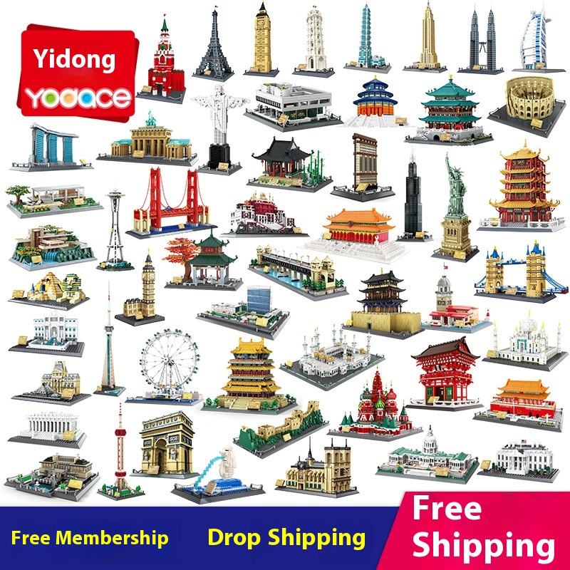 Punto di riferimento del mondo di affrancatura costruzione di gru gialla torre tempio cielo quadrato giocattolo educativo in plastica blocchi regalo