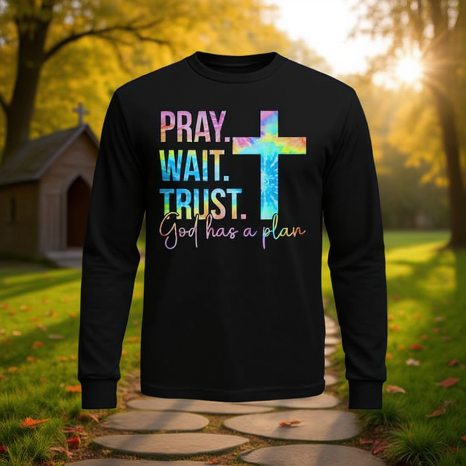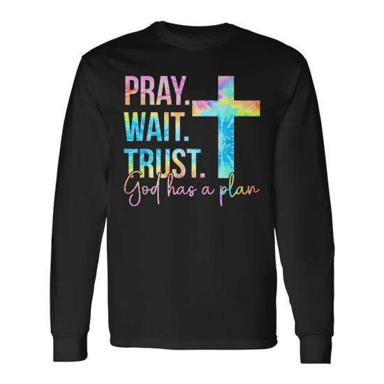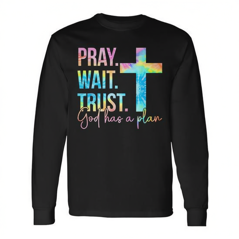 Maglietta Religiosa a Maniche Lunghe con Stampa Tie Dye 'Preghiera, Pazienza, Fiducia in Dio', Abbigliamento Promozionale a Tema Fede