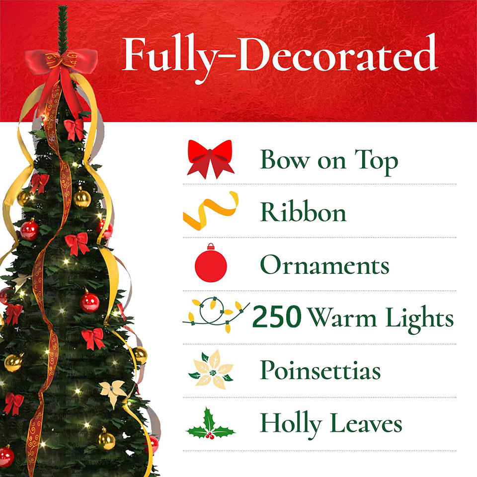 Albero di Natale Pop-Up Artificiale Pieghevole Pre-Decorato 180 cm con 250 Luci LED, Supporto e Montaggio Facile, Albero Pre-Illuminato con Festoni