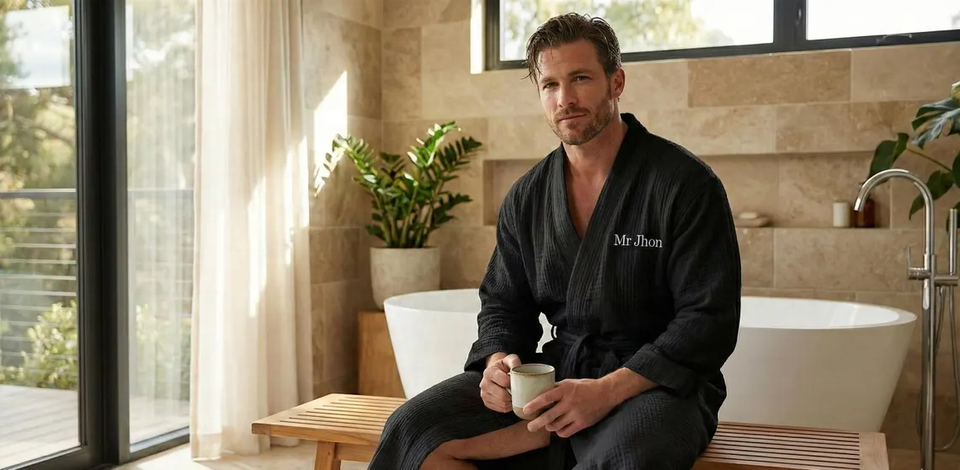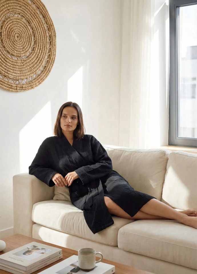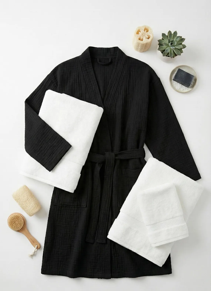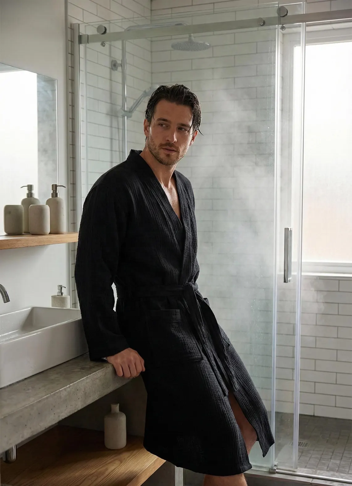 100% Cotton Breathable 4 Layer Muslin Cotton Gauze Black Robe for Men