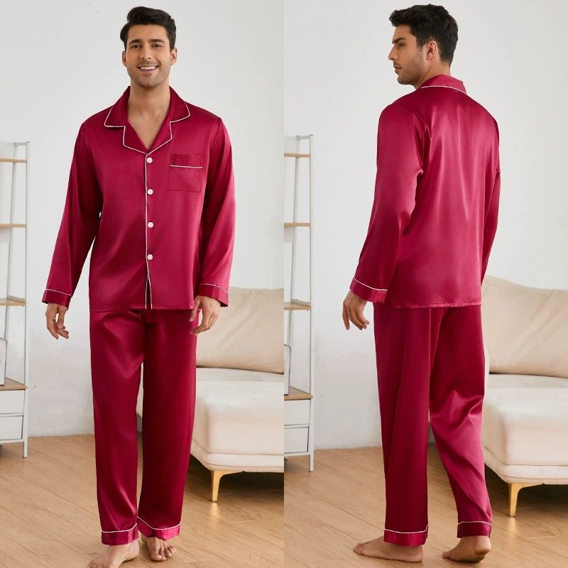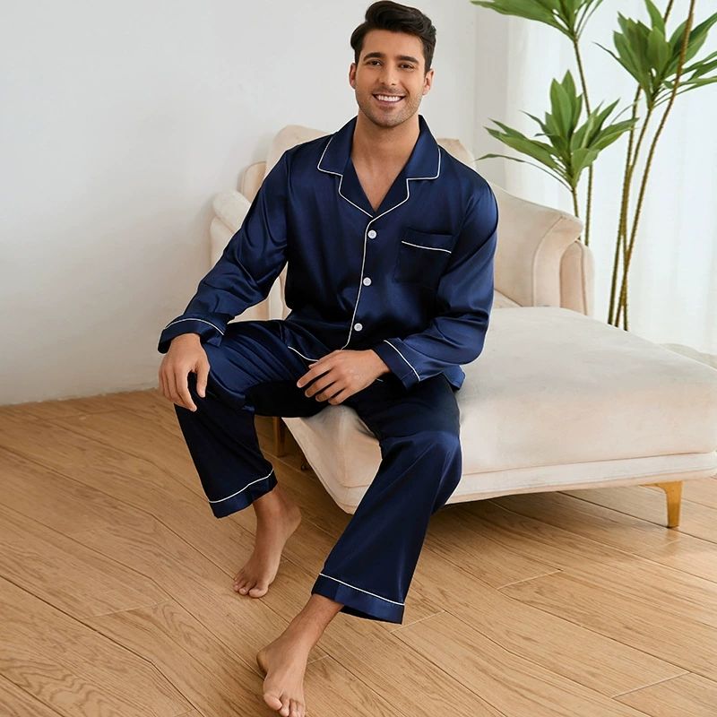 Premium Black Ice Silk Men Wedding Pajamas White Piping Contrast New Arrival Men Long Pajamas Solid Color