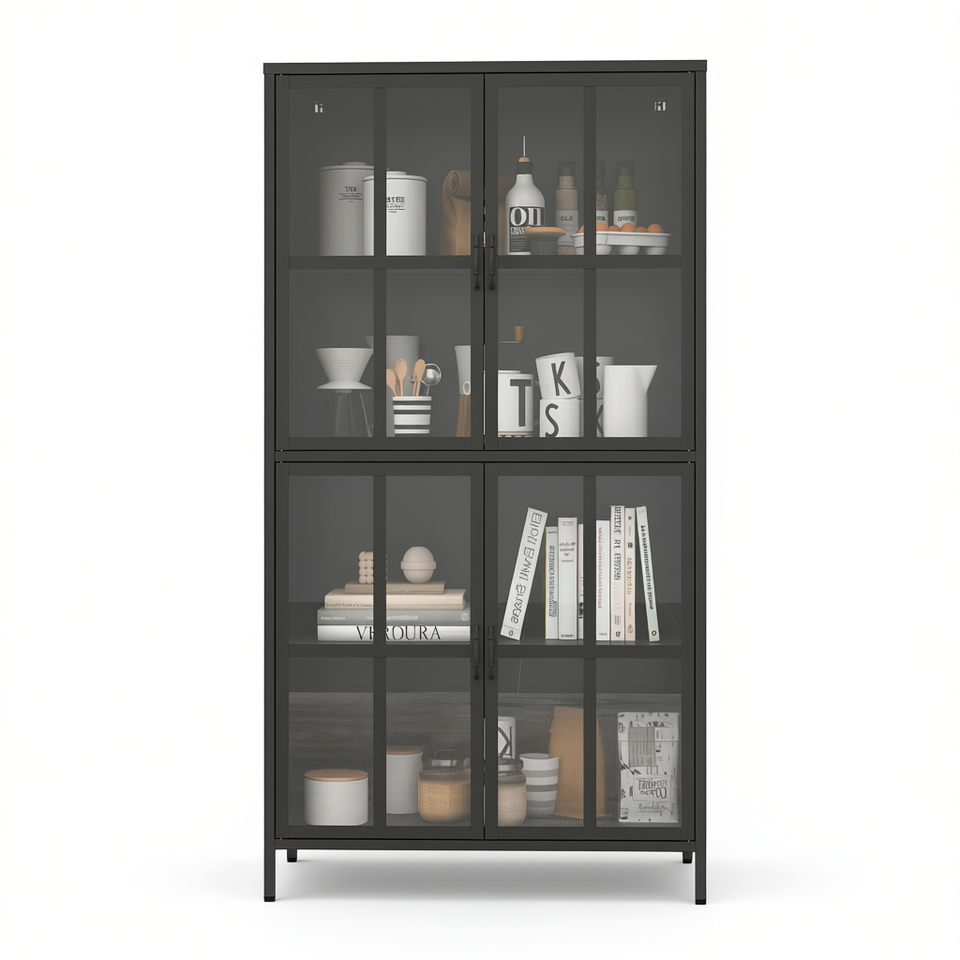 Black Metal Storage Cabinet Tempered Glass Doors Adjustable Shelves Key Lock Home Office Filing Cabinet Industrial Design