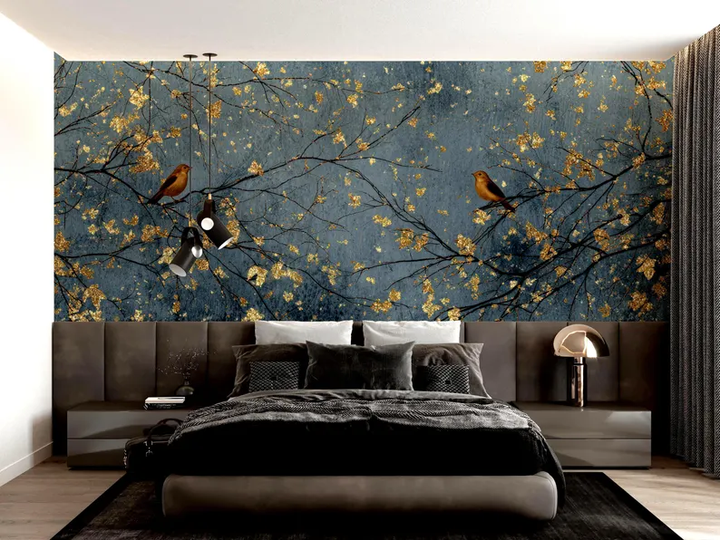 Keywords:Premium Dark Blue and Gold Bird Branch Wallpaper