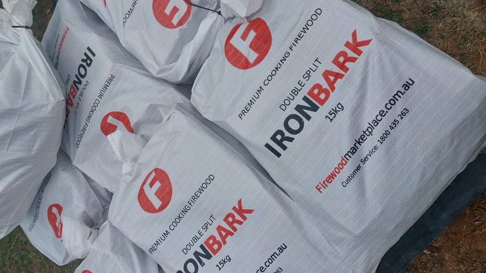 Premium Ironbark Hardwood Firewood 15kg Bags Bulk & Custom Branded Fuel for Grilling BBQs Wood Smokers Outdoor Firepits