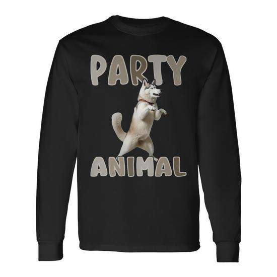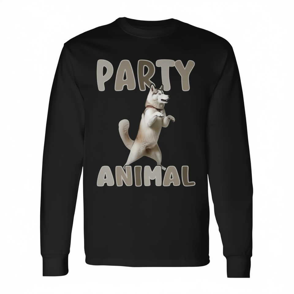 T-shirt Premium a Maniche Lunghe con Design Husky Animale da Festa dall'Energia Danzante e Vibrante - Per Uso Promozionale