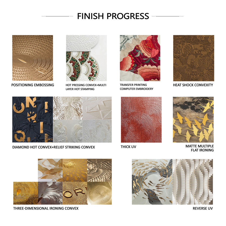 Stampaggio a freddo, Abbronzante, Fustellati, Goffratura, Goffratura/impresso, Stampa flessografica, GLITTER, Laminazione lucida, Stagnola di oro, Macchina da stampa rotocalco, Stampa olografica, Laminato, Taglio Laser, Laminazione del Matt, Membrana tectoria, stampa offset, Serigrafia, Lamina d'argento, Timbratura, Testurizzato, Rivestimento UV, Sparizione, Stampa uv, Verniciatura