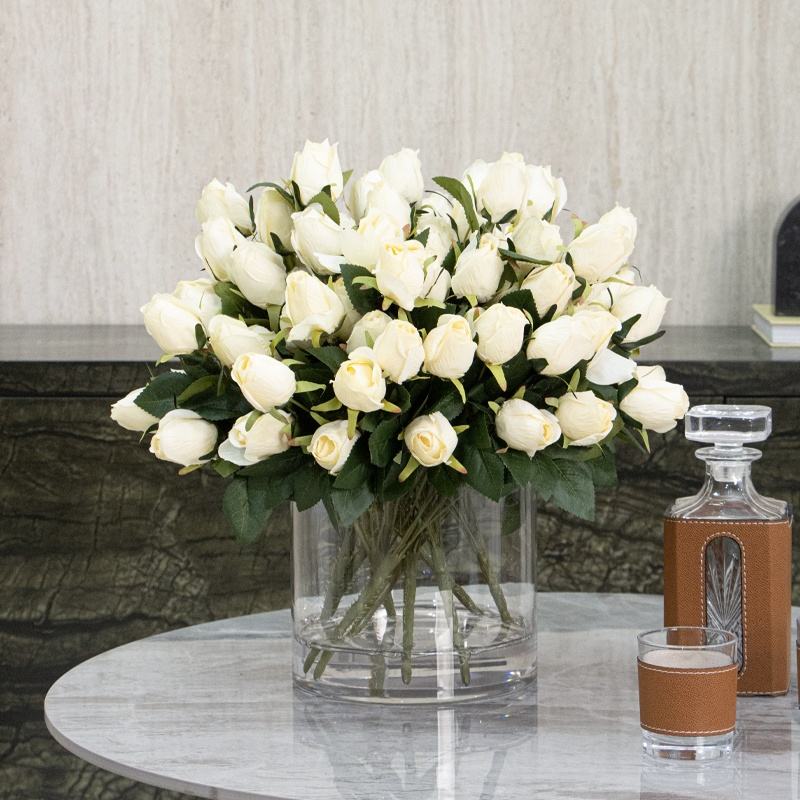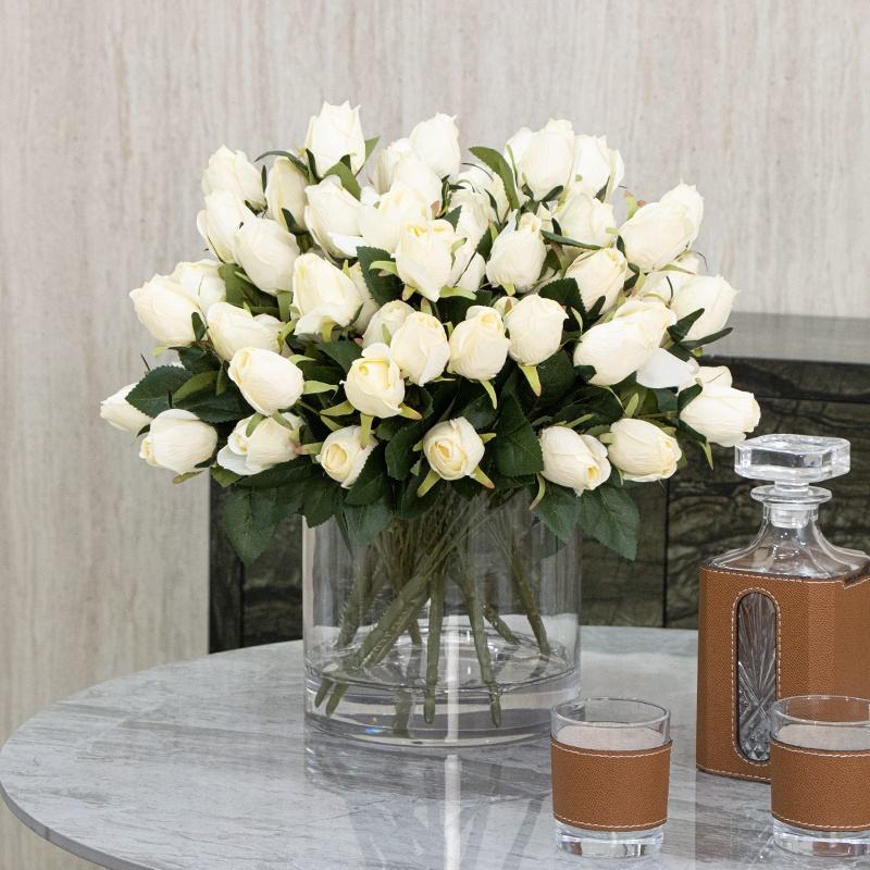 Bouquet di Boccioli di Rosa & Acqua Finta & Vaso in Vetro
