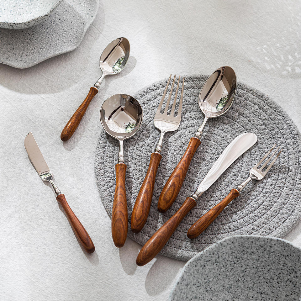 Set di stoviglie Vintage Premium 18/10 posate lucidate a specchio Set cucchiai, forchetta, coltello da bistecca, coltello da burro con manico in legno rosa