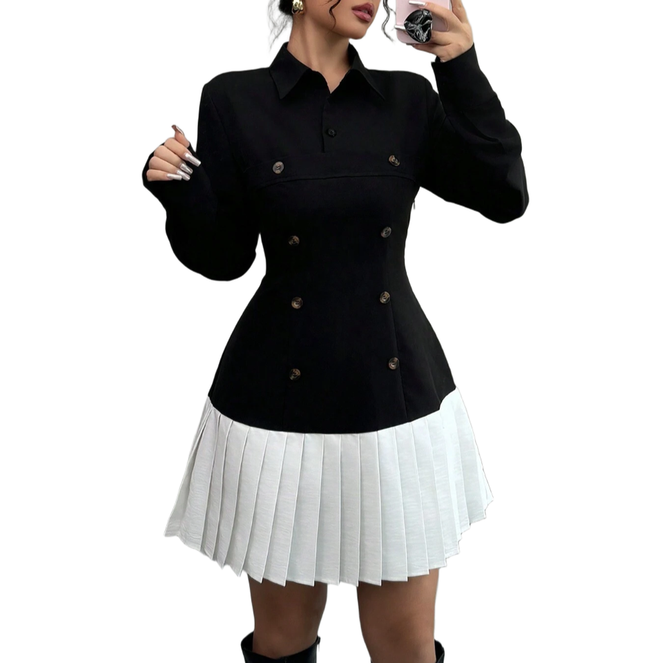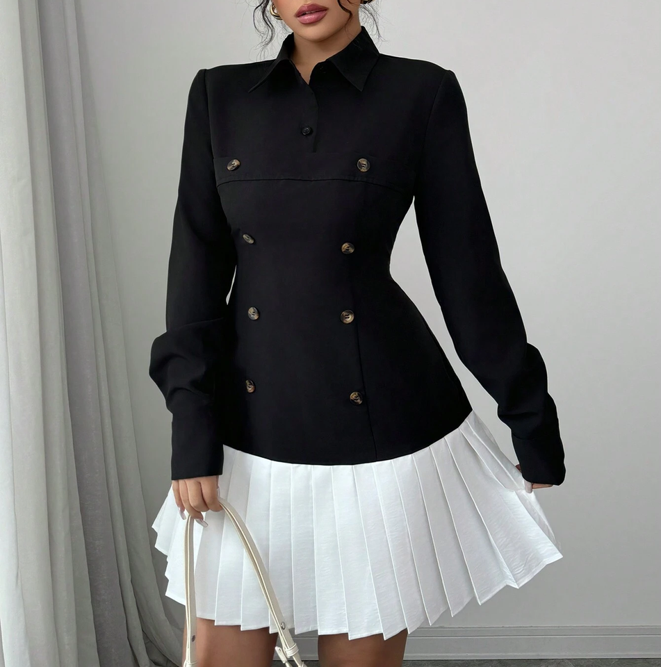 Preppy Aesthetic Black White Patchwork Blazer Dress Women Double Breasted Pleated Mini Dress Casual Party Office Wear