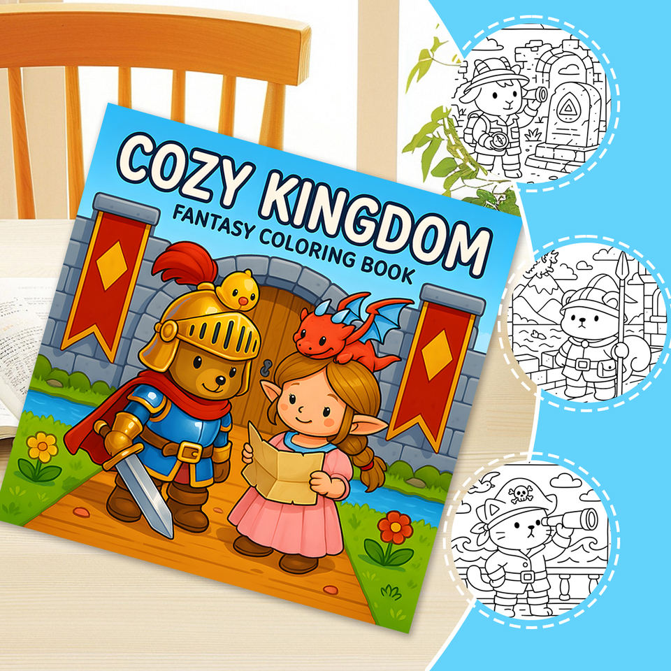 Libro da colorare "regno accogliente" a tema principessa e cavaliere, libro da colorare Fantasy con castello, drago e simpatici personaggi