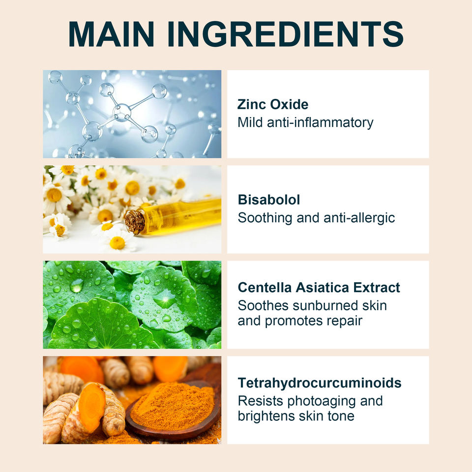 Zinc Oxide, Bisabolol, Centella Asiatica, TetrahydrocurcuminoidsIngrediente principale