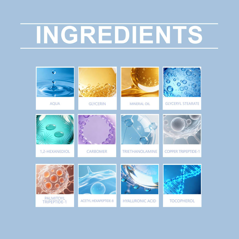 Hyaluronic Acid, Peptide, Glycerin, glyceryl stearate, palmitoyl tripeptide-1, copper tripeptide-1, acetyl hexapeptde-bmain ingredient