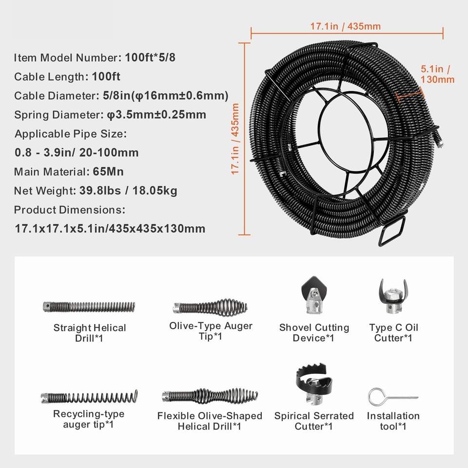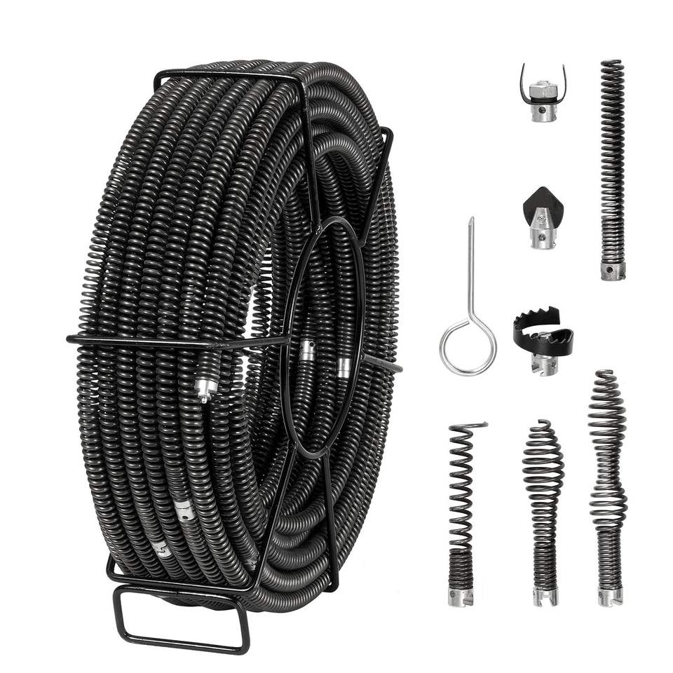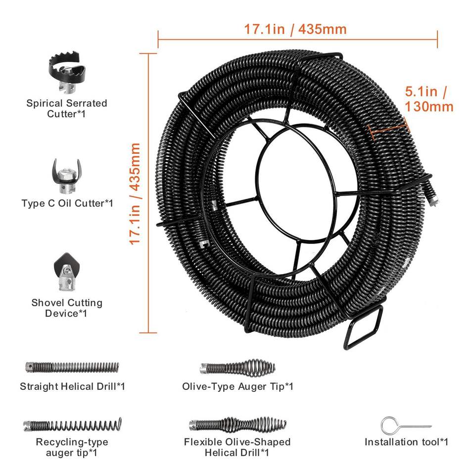 Cavo Professionale per Pulizia Scarichi da 30 Metri x 1,6 cm con 7 Tagliacavi, per Tubi da 2,0 cm e 9,9 cm, Cavo Sezionale a Sezione Cava per la Pulizia di Tubature