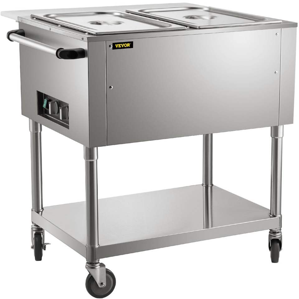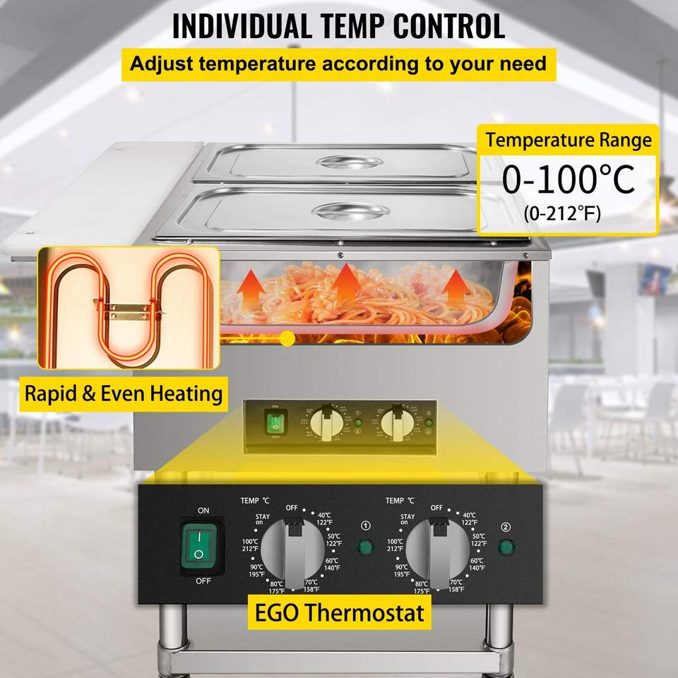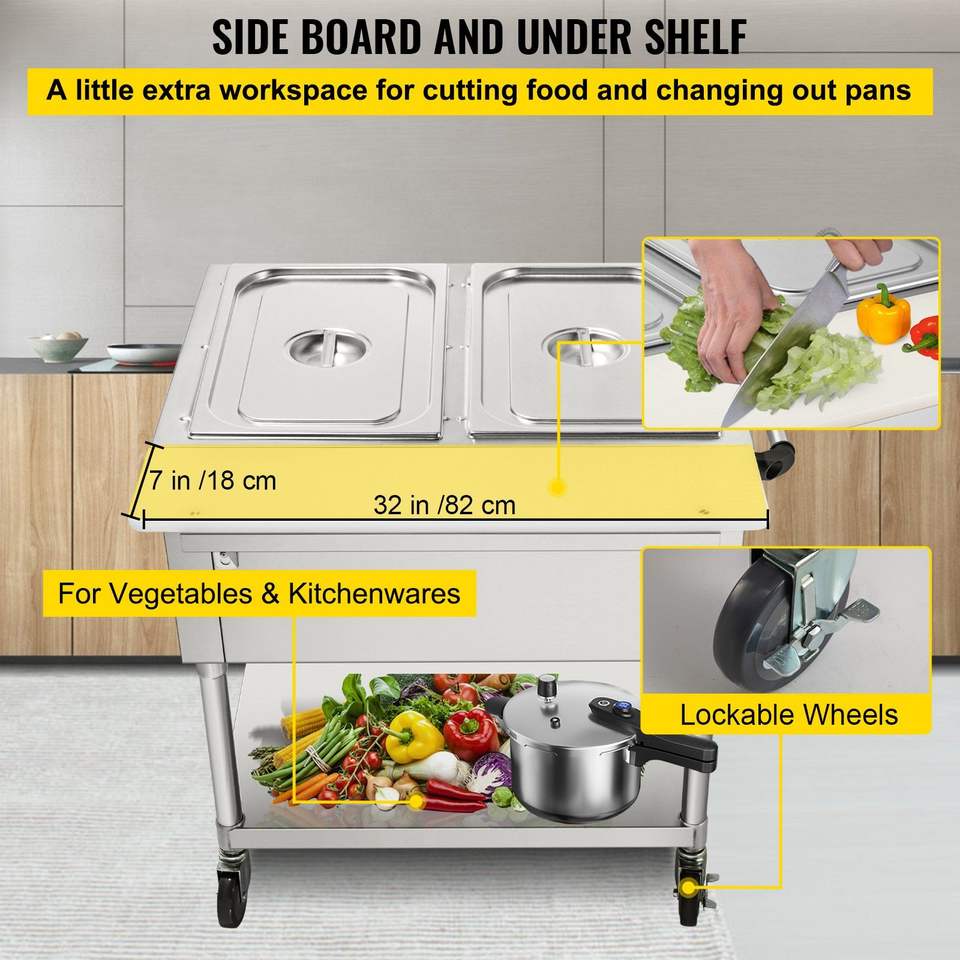 Professional Commercial Electric Food Warmer 2-Pot Stainless Steel Steam Table 0-100 Degree C Range Lockable Wheels Catering