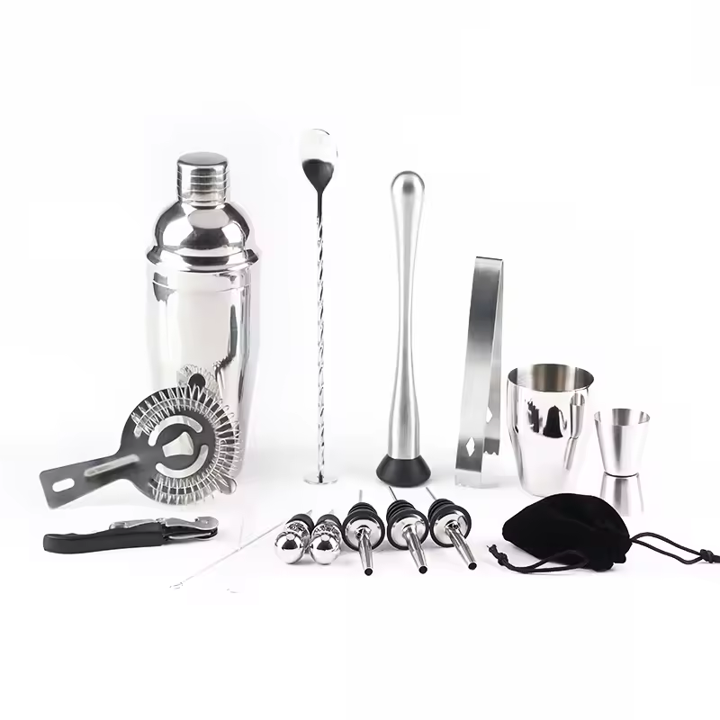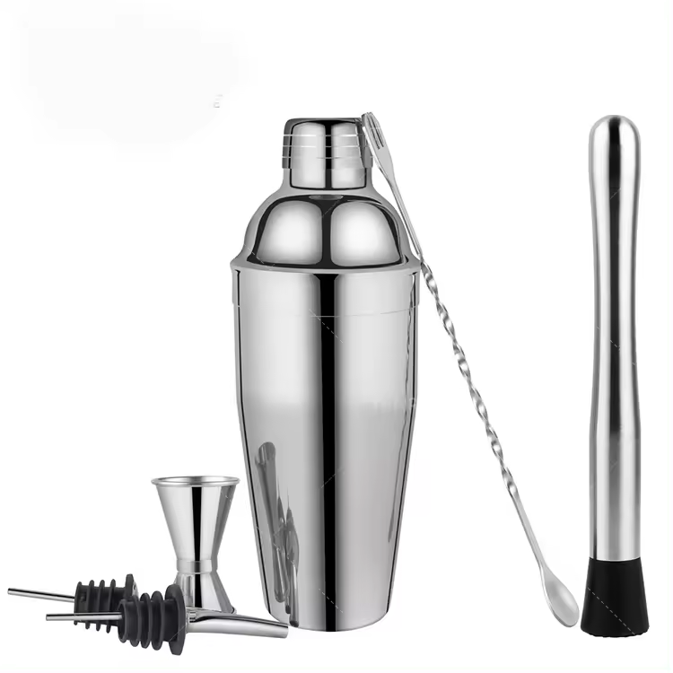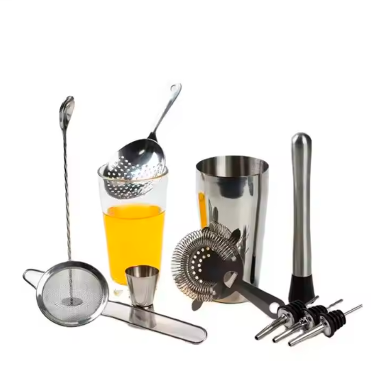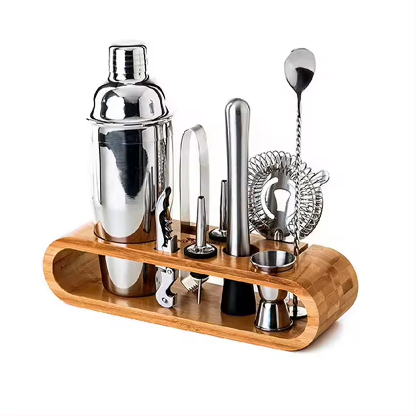 Professional Gold Plated Stainless Steel Bar Ware Tools Set 9 Pcs Bartending Kit Wooden Stand Kitchen Cocktail Shakers