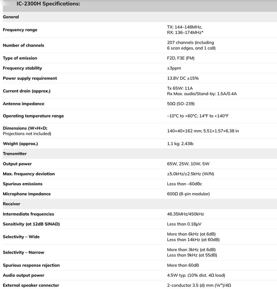 IC-2300H ricetrasmettitore mobile VHF 136–174 MHz 65 W per veicoli e uso marino, 207 canali, CTCSS/DTCS, LCD 70,6×20 mm