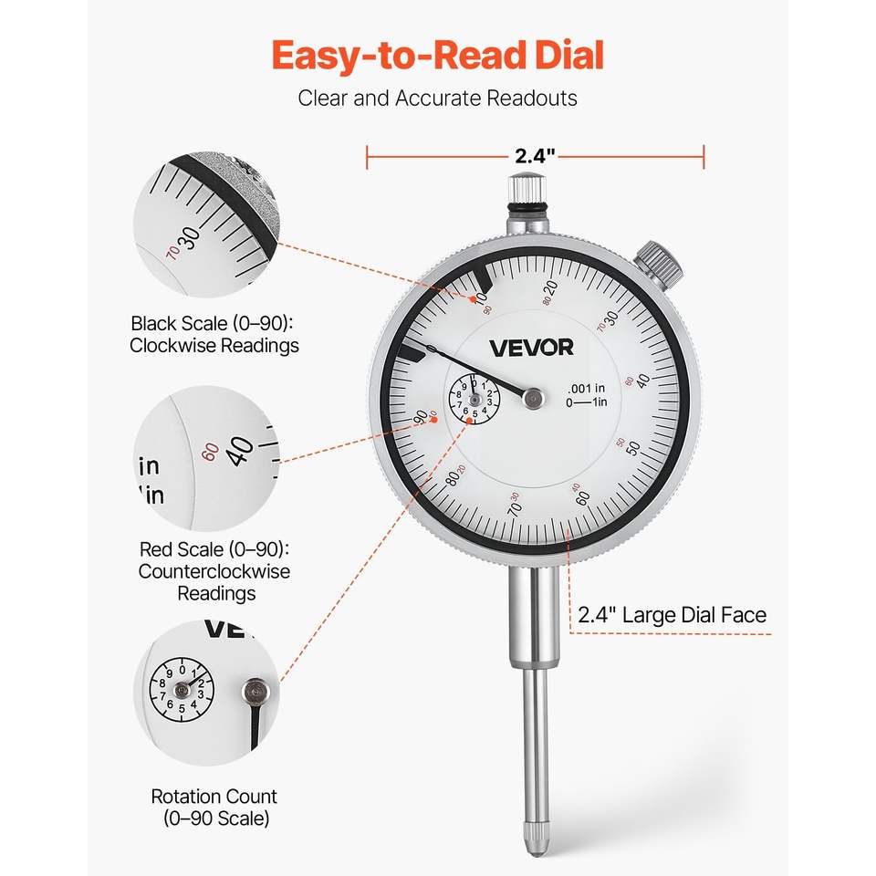 Quadrante Professionale per Comparatore di Precisione con Ampio Quadrante Facile da Leggere, Precisione 0,001 Pollici, Range 0-1 Pollici, Base in Metallo
