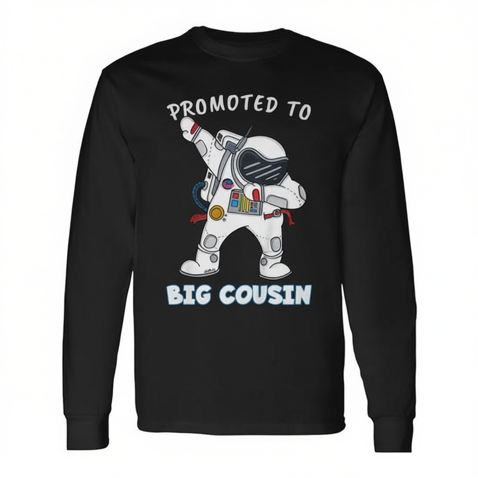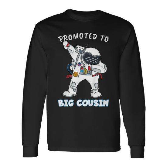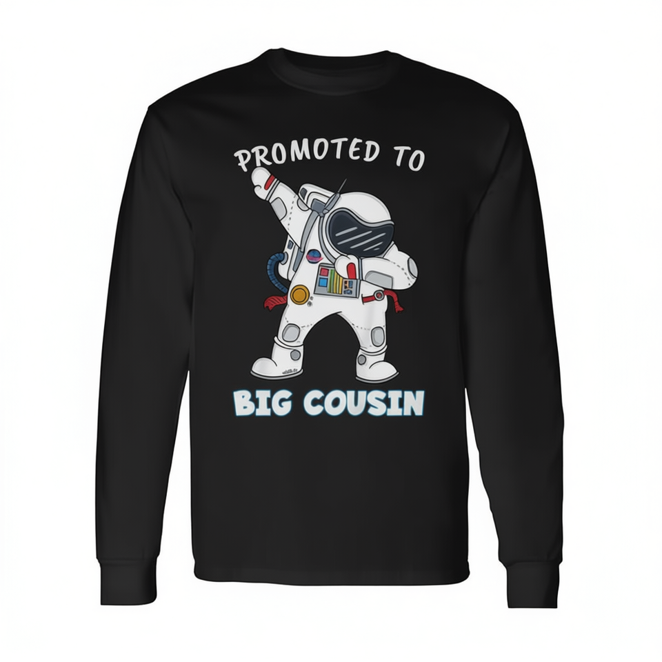 Maglietta a maniche lunghe per bambini con stampa digitale, girocollo, con stampa di un astronauta che fa dabbing e scritta 'Promoted To Big Cousin'.