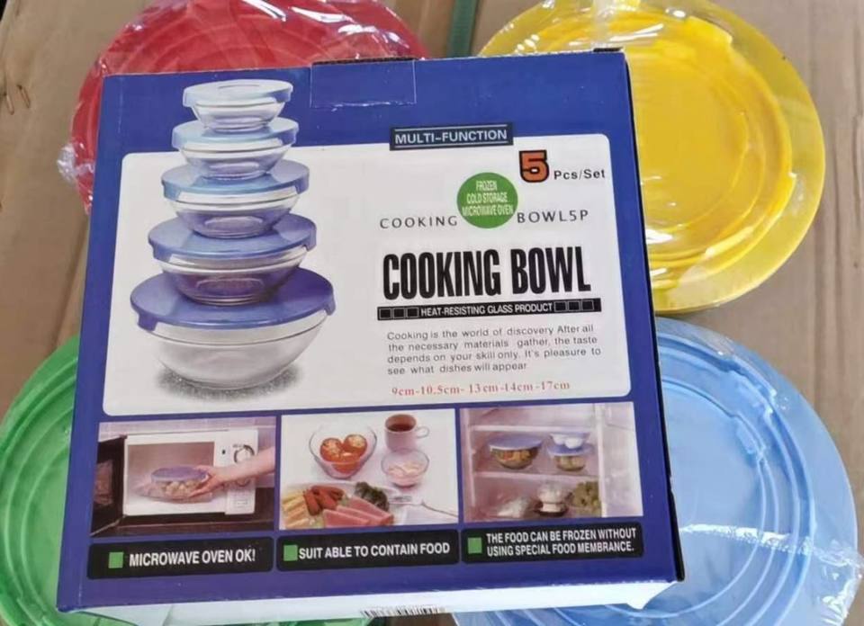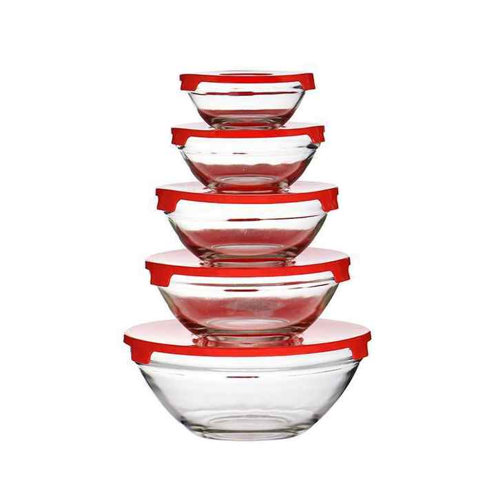 Grande capacità di promozione 5 pezzi di vetro Microwavable ciotole per insalata Set con coperchi vetreria insalata caramelle ciotola di conservazione della frutta