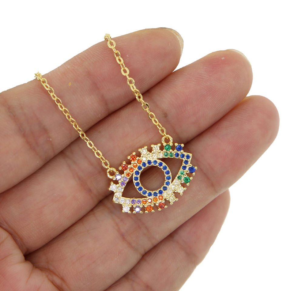 Promozione micro pavimenta cz placcato oro arcobaleno di colore fortunato dei monili turco dell'occhio diabolico della mano di hamsa pendente della collana
