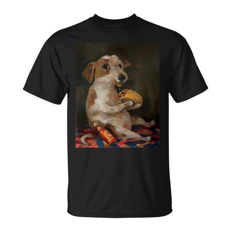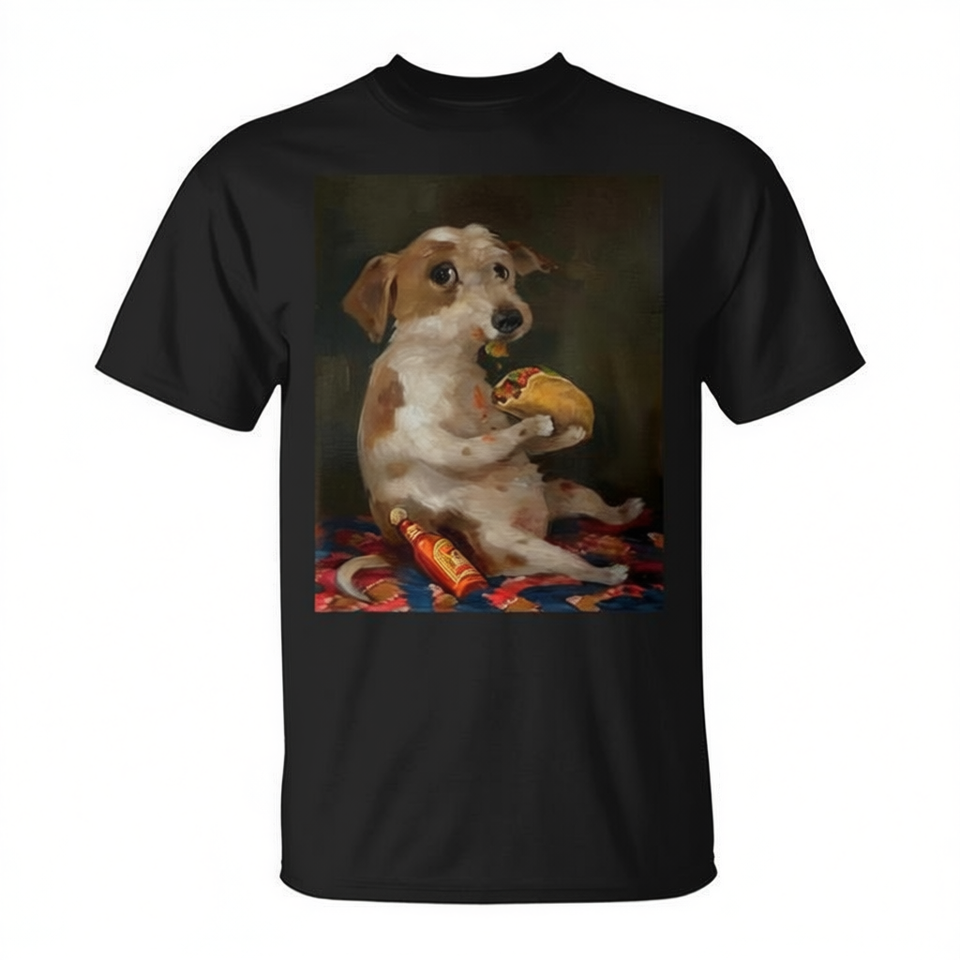 Maglietta promozionale con cane che mangia un taco con salsa piccante