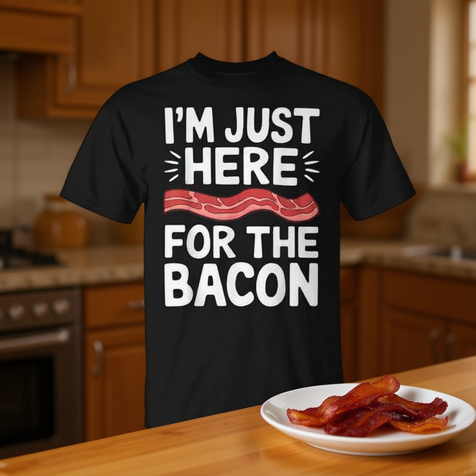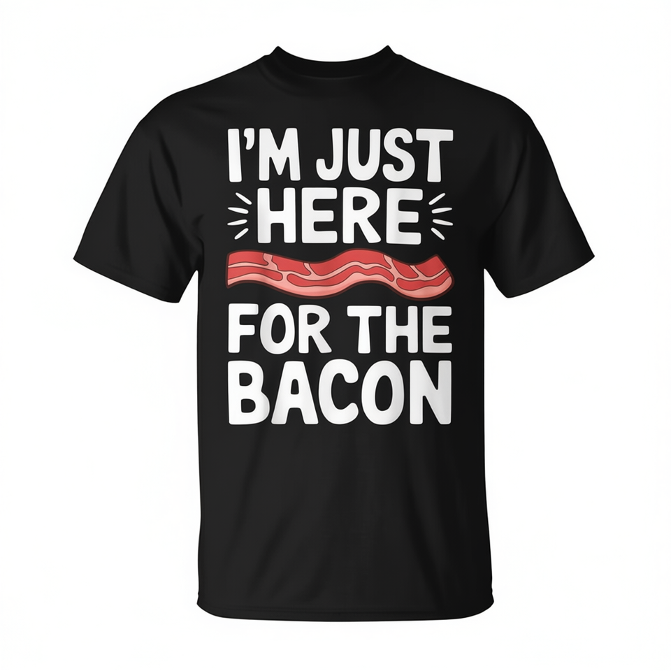 T-shirt Promozionale 'I'm Just Here for the Bacon' con Design Accattivante a Tema Bacon