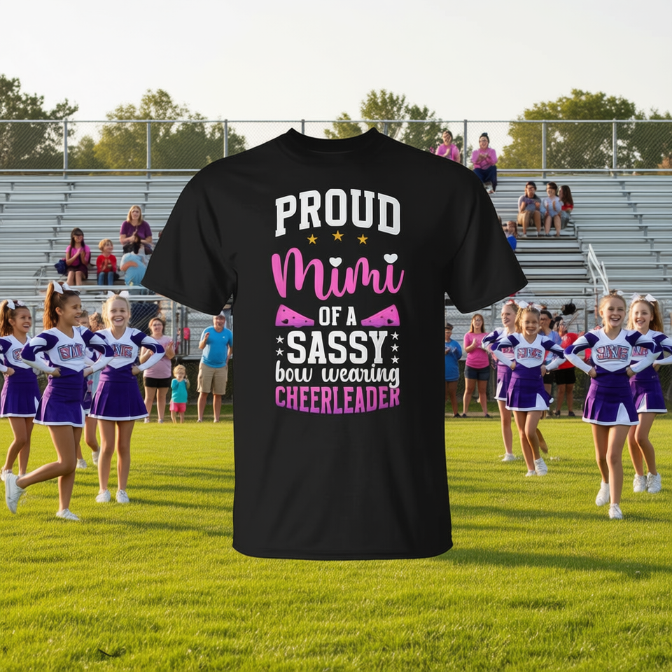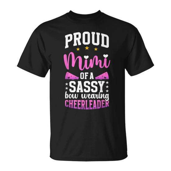 T-shirt orgogliosa con scritta 'Mimi Of A Sassy Cheerleader' per nonna con design a fiocco