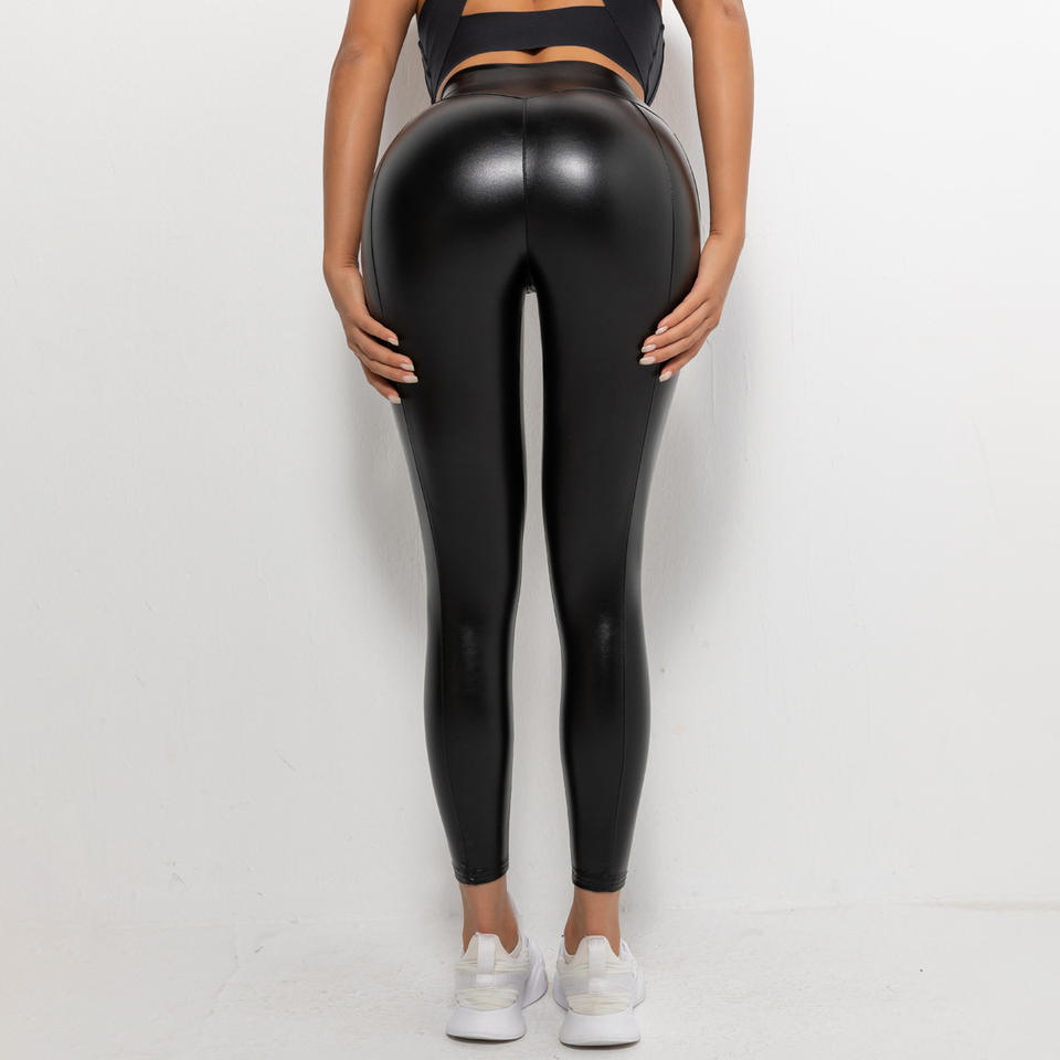 Pantaloni in pelle sintetica pantaloni attillati neri attillati in tinta unita alti elastici che corrono pantaloni da Yoga per il Fitness