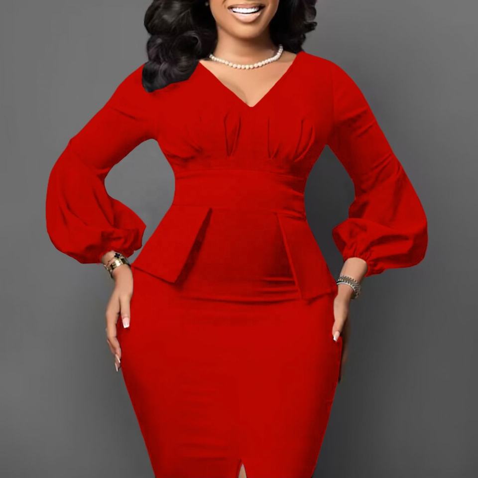 Abito con Maniche a Sbuffo, Scollo a V Profondo, Tinta Unita con Spacco, Abiti da Ufficio Formali per Donne, Abiti da Lavoro Professionali