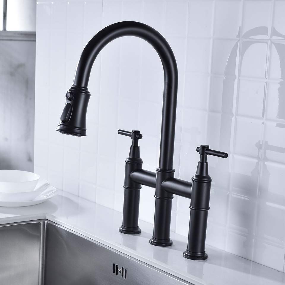 Rubinetto da cucina a ponte con doccetta estraibile e finitura satinata