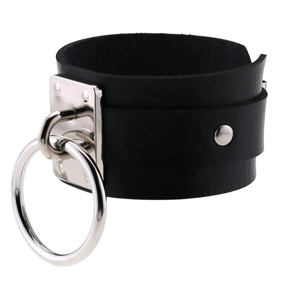 Punk Oversized Double Layer Leather Band Cover Wrist Bracelet Bondage BDSM Silver Metal O Round Gothic Bangles