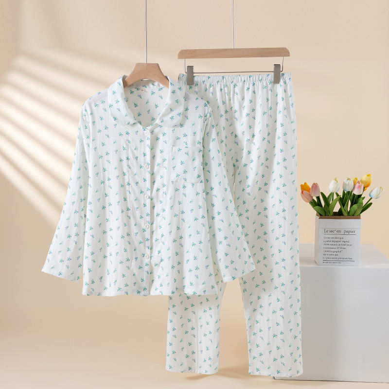 Pure Cotton Class a Minimalist Style Double-Layer Gauze Women's Long-Sleeve Floral Printed Pajamas Lightweight Homewear Set