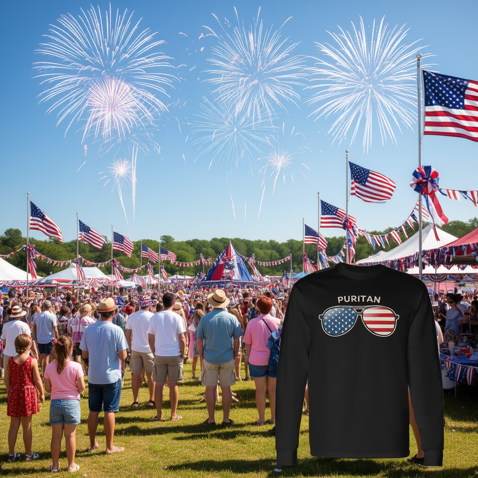 T-shirt puritana a maniche lunghe con design a occhiali da sole con bandiera americana