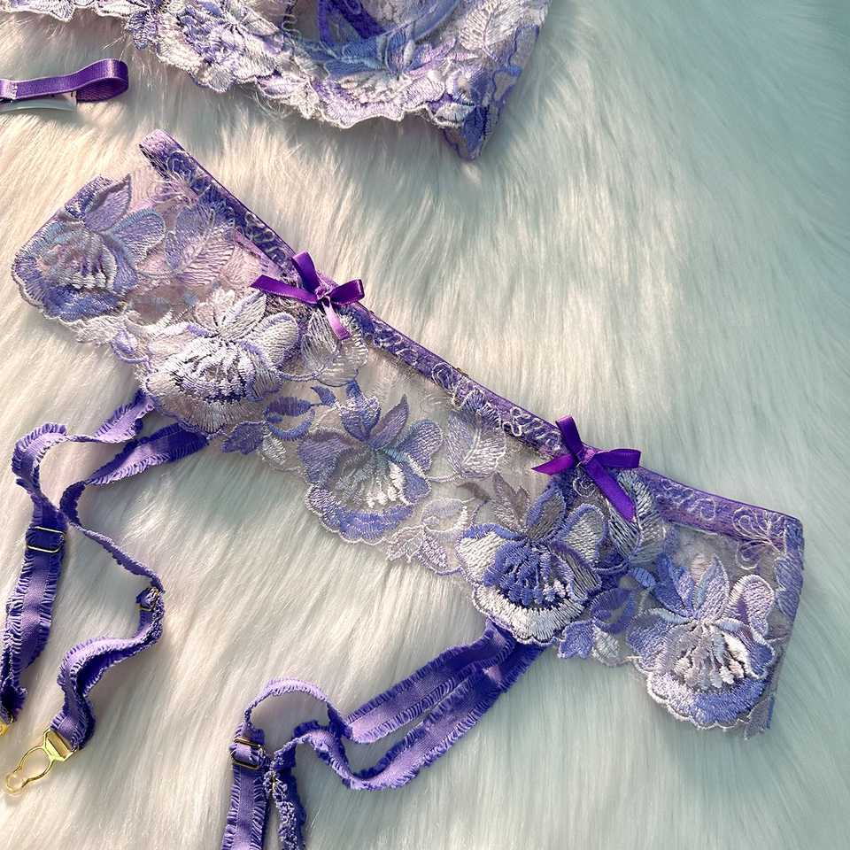 Purple Floral Lace Trim Beautiful Women Sex Lingerie Flower Embroidery Nightwear Set With Garter Belt