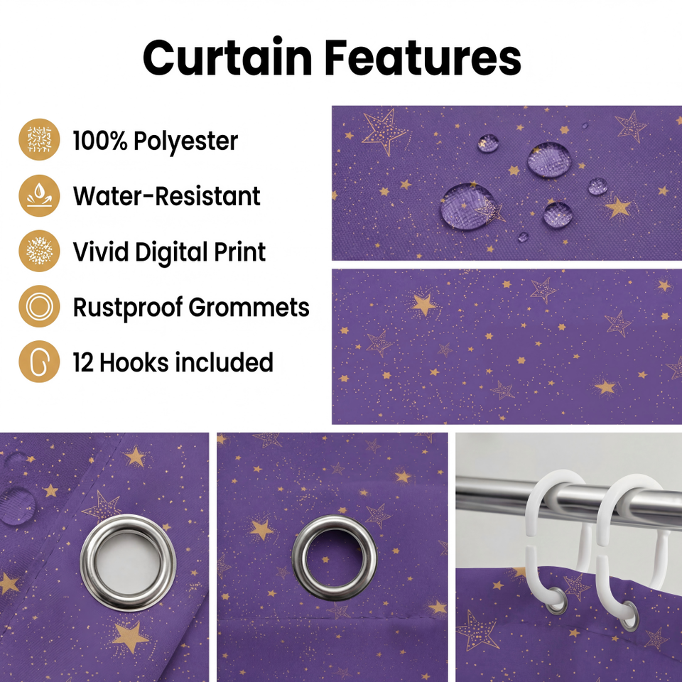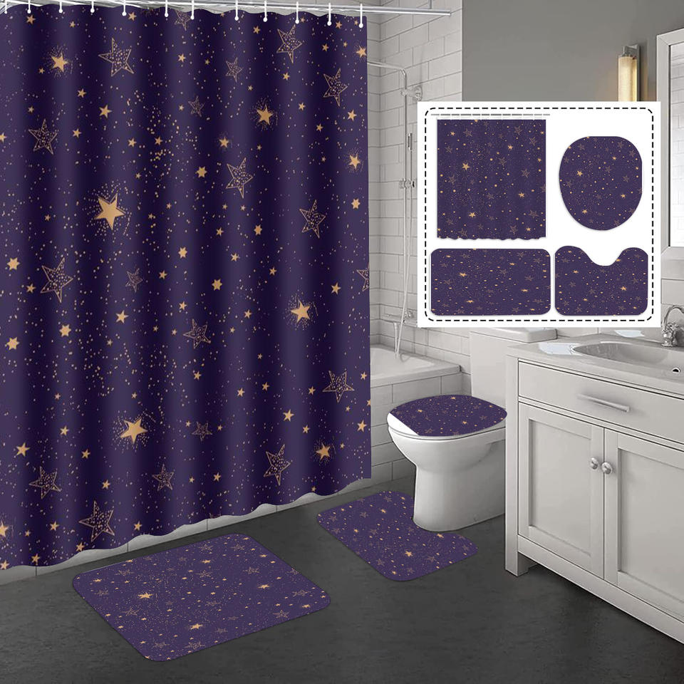 Set Tenda Doccia Impermeabile in Poliestere Viola Galassia 4 Pezzi con Tappetino da Bagno Lavabile in Lavatrice