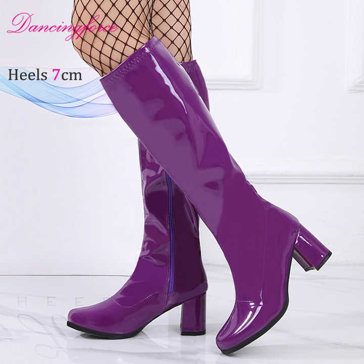 Stivali Viola Pat Costumes per Feste in Maschera, Stivali da Donna Western Gotici, Scarpe da Ballo Retrò Anni '60 '70, Stivali Gogo Alti al Ginocchio