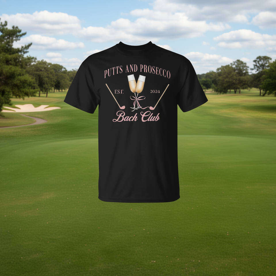 T-shirt Unisex a Maniche Corte con Stampa Serigrafica Putts and Prosecco Bach Club 2024 per Festa di Addio al Nubilato a Tema Golf