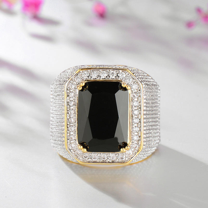 Anello da Cocktail Q315 in Oro Bianco per Uomo con Zaffiro Taglio Smeraldo e Incastonatura Pavé, Design Geometrico, Gioiello Raffinato da Regalo