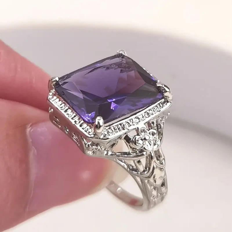 Q437 Women's 925 Silver Cocktail Ring Emerald Cut Moissanite Bezel Setting Flower Pattern Engagement Ring
