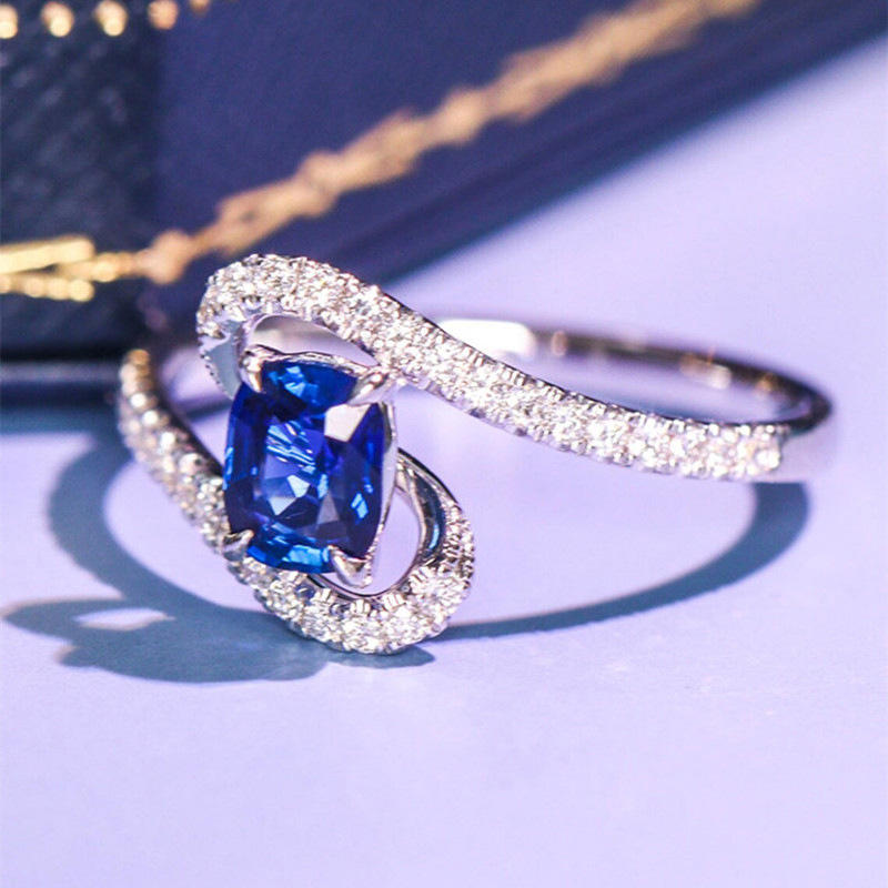 Q707 Women's 18K Solid Gold Engagement Ring With Natural Diamond Cushion Cut Side Stones And Blue Sapphire Center Stone