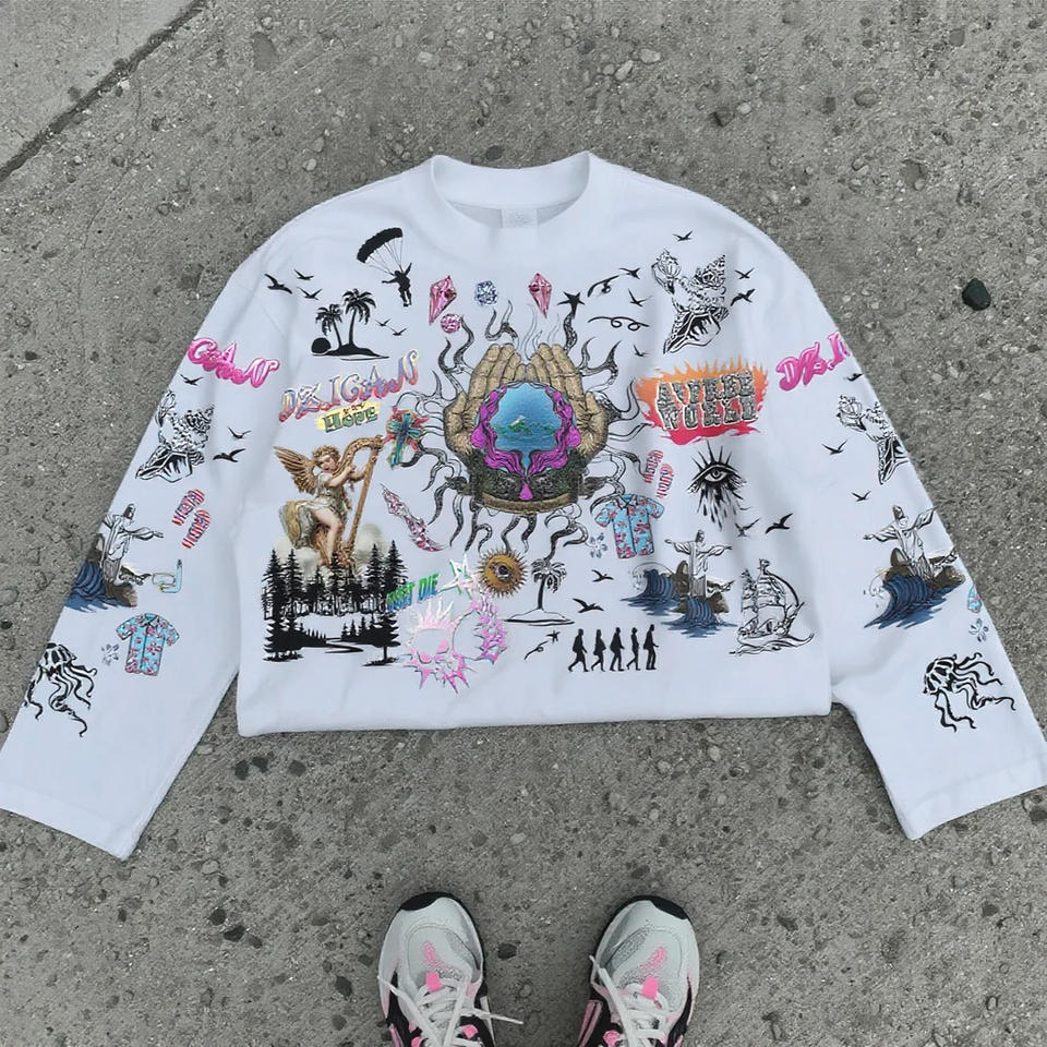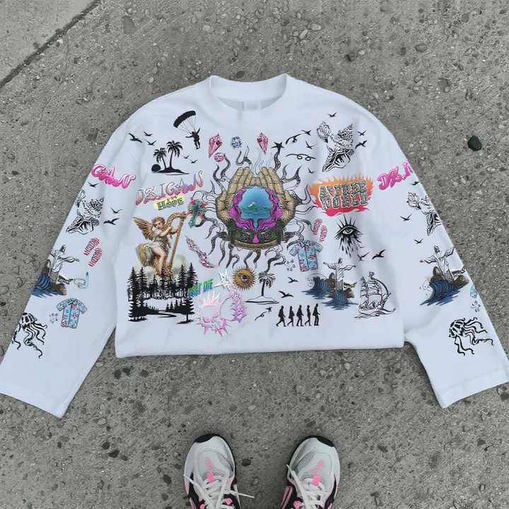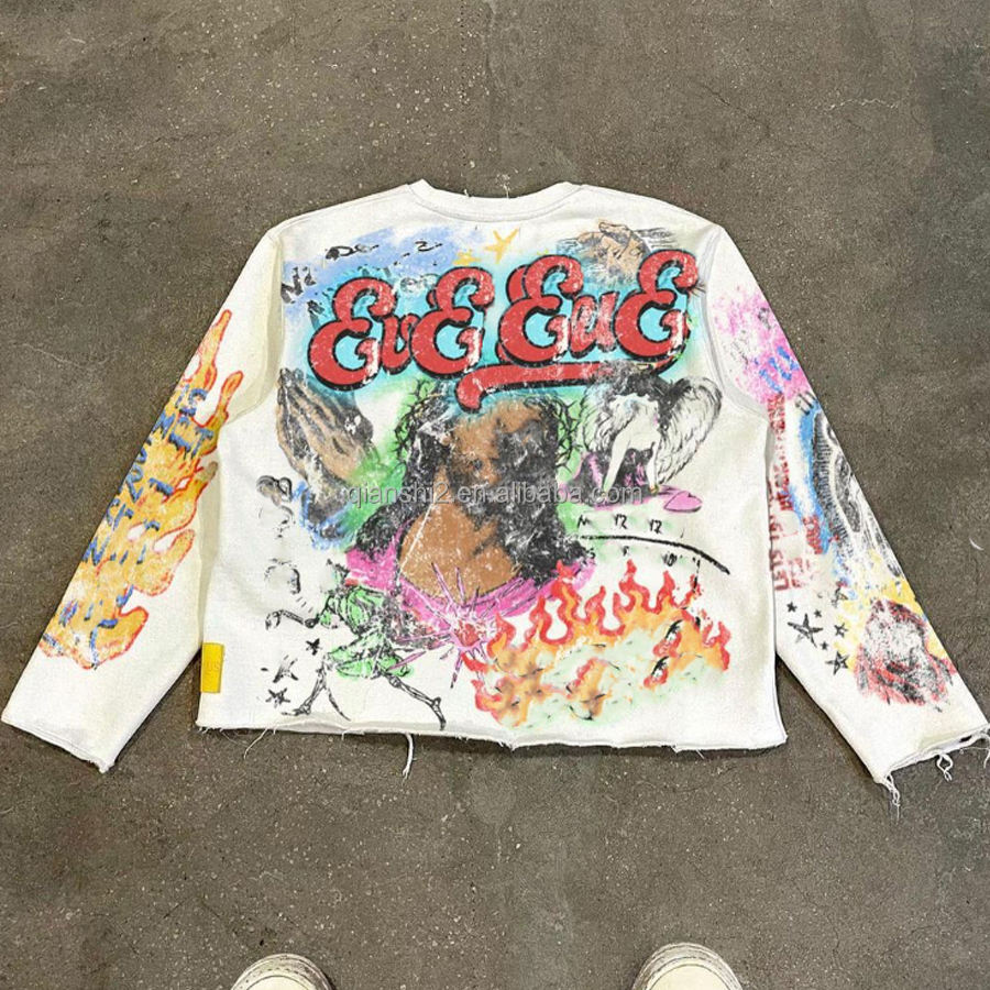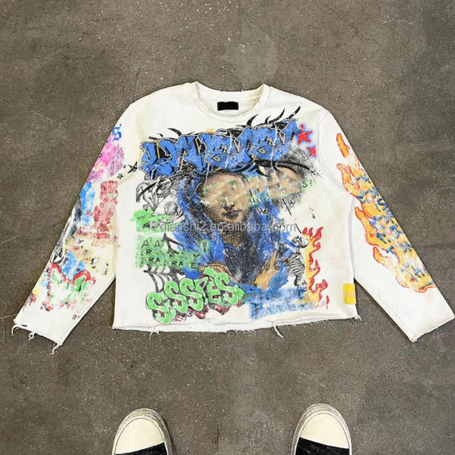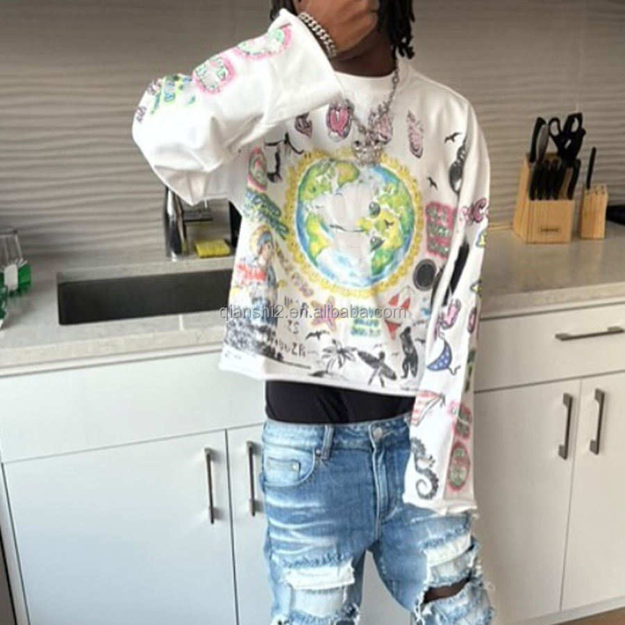 QIANSHI Custom Heavyweight Cotton Oversized Boxy Graphic T-Shirts for Men High Quality 300gsm Cropped Men Long Sleeve T Shirt
