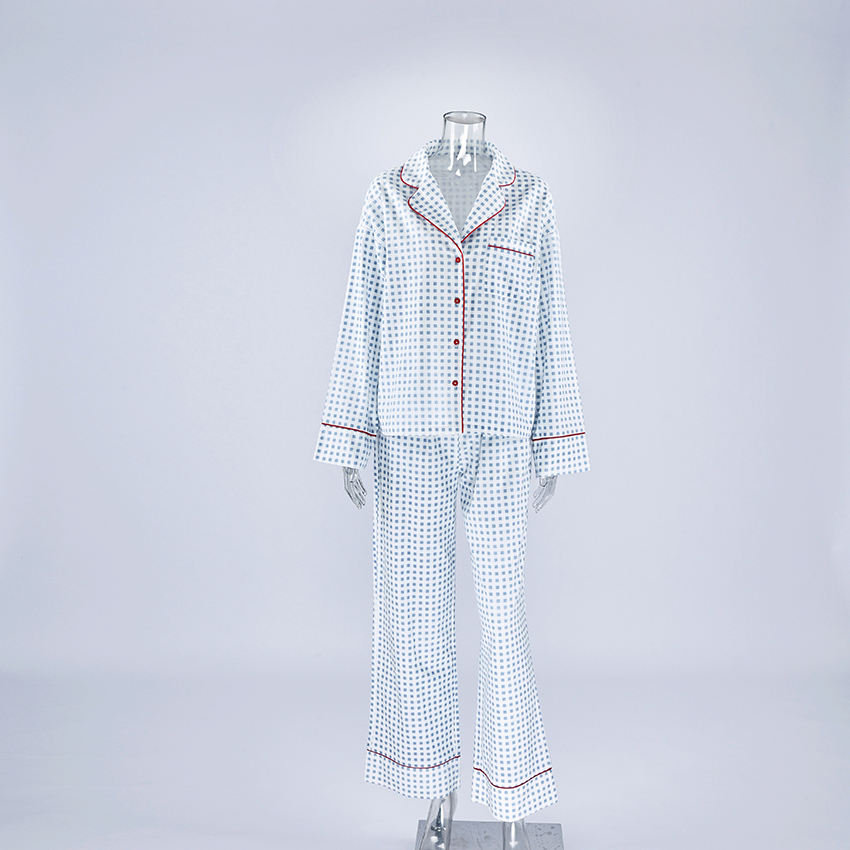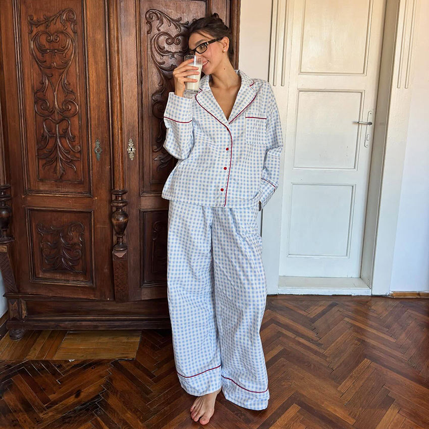 QINSI Women's Fashion Loungwear Full Sleeve Cotton Pajamas Soft Plaid Gingham Nightwear with Piping for Spring Loungewear