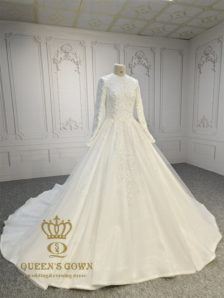 Abito da Sposa QUEENS GOWN Moderno a Maniche Lunghe con Vita Basca Collo Alto Gonna in Tulle Brillante con Glitter