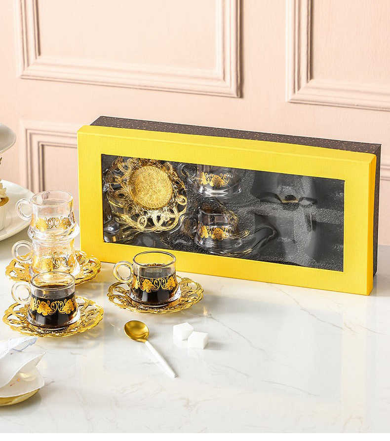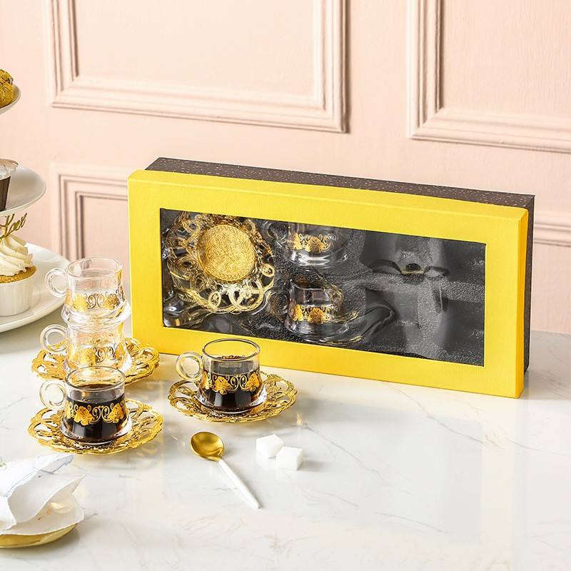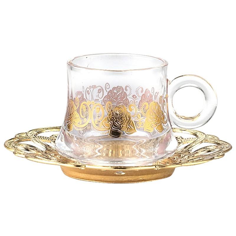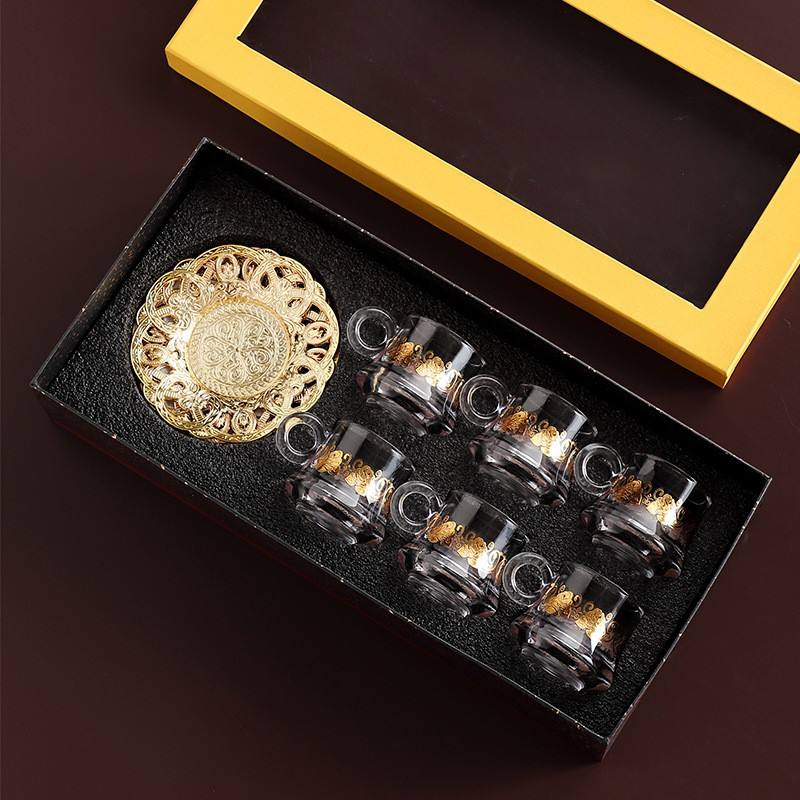 Set regalo Qian Hu Set da tè turco tazze da caffè in vetro arabo di lusso sublimazione con decorazione vassoio in metallo piatto dorato