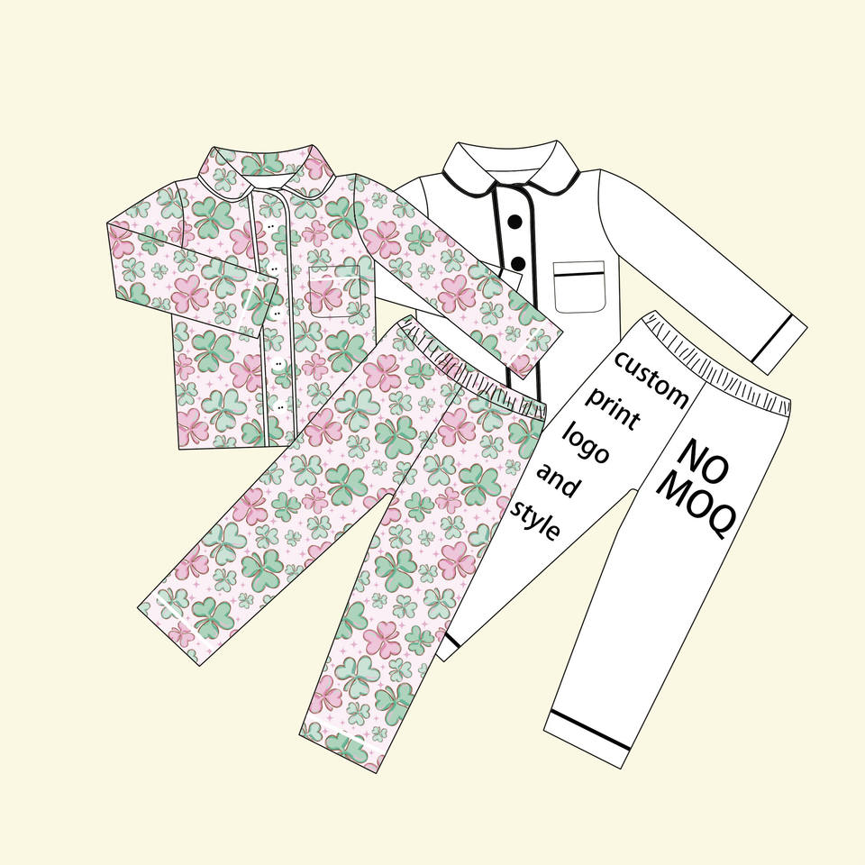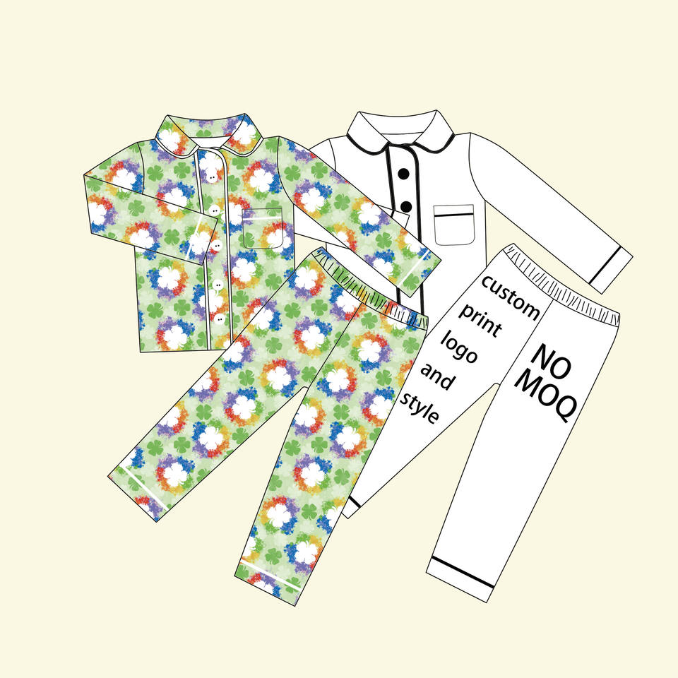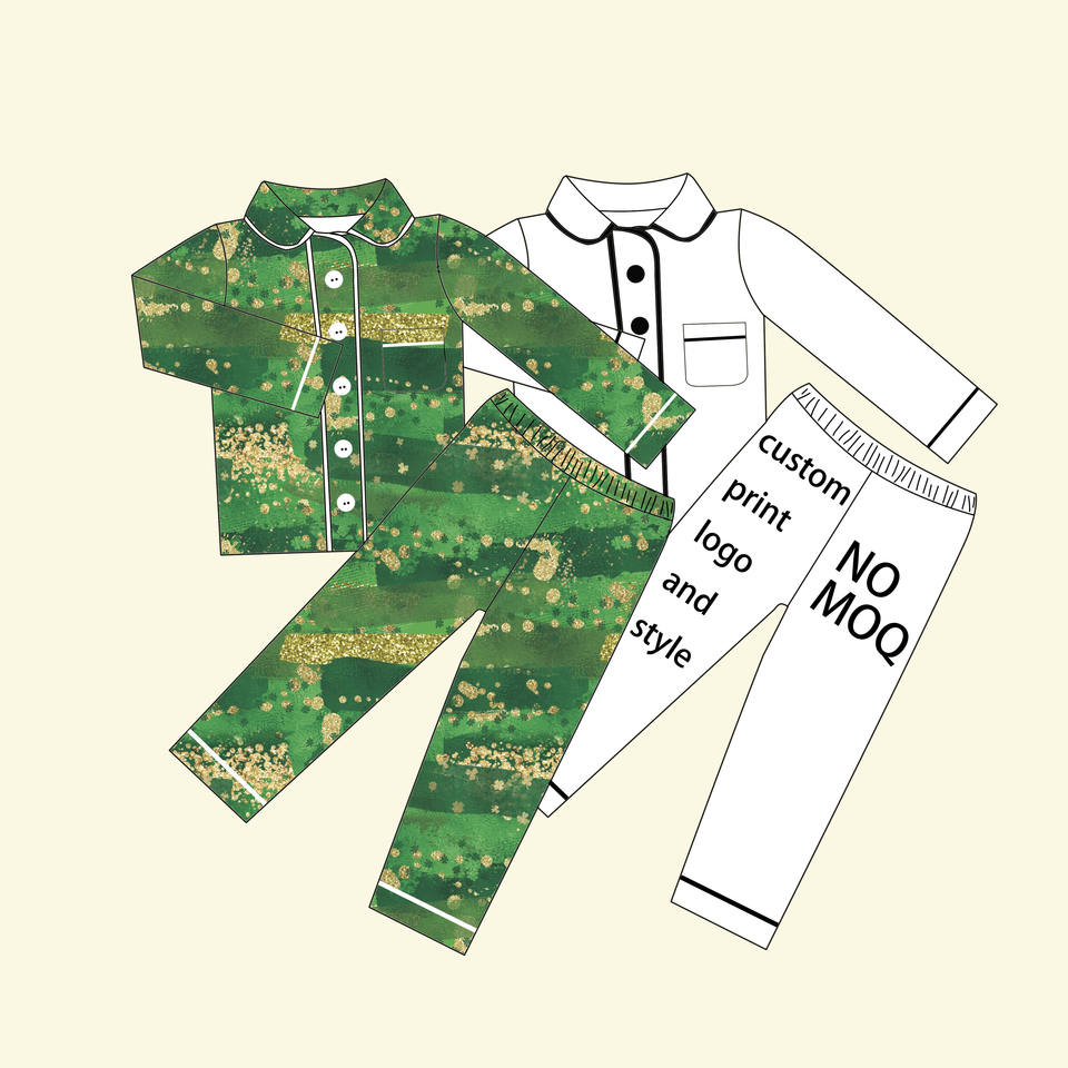 Qingli OEM Custom No Tariff Boutique Patrick's Day Long Sleeve Shirt and Pants Green Plant Print Bamboo Kids Two-pieces Outfit