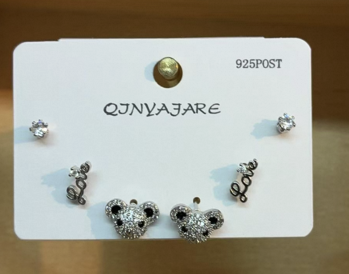 Qjnyajare 3 Pairs Stud Earrings Silver Alloy Zircon Cartoon Love Letter Bear Women's Fashion Jewelry Gift